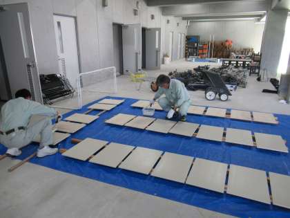 ピロティで、何やら四角い板を何枚も作り、ペンキで色を塗っておられます。