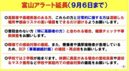 そこで、23日(火)が期限だった県独自の感染拡大警報「富山アラート」が2週間延長され、9月6日(火)までとなりました。