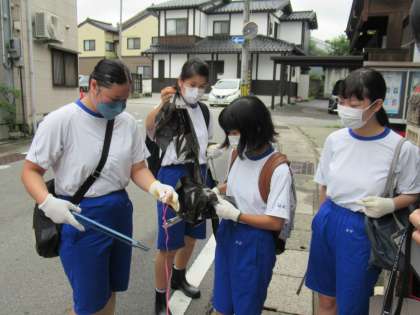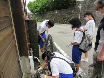 それぞれ30名を越える生徒が参加し、合計で60名近くの生徒が旧町の清掃活動を行いました。日頃から美しい旧町には、あまりゴミが落ちていませんが、それでも、生徒は小さなゴミも見逃さず拾っていました。