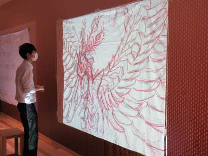 技術室前の壁に布を貼り、chromebookで作成した下絵を投影して、下書きを作成しています。文明の利器をふんだんに使っています。