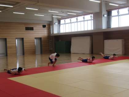 柔道部は、基礎トレーニング中です。礼儀正しく挨拶もできています。