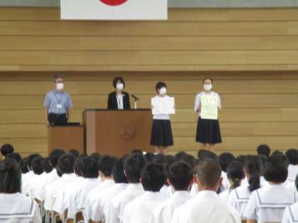 吹奏楽部は、中部日本吹奏楽コンクール富山県大会 銅賞、1年生は、先日行われた少年の主張富山県大会 優秀賞の表彰を行いました。