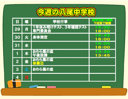 今週は、おわら風の盆のため、1日(木)は給食後午後放課、2日(金)は休業日です。2日は部活動もありません。