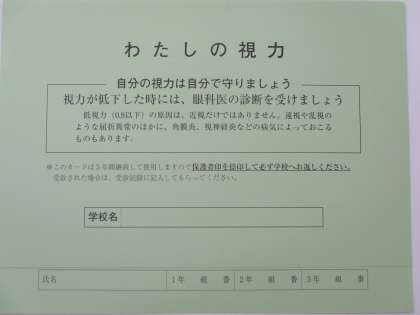 視力検査の結果、裸眼視力が1.0以下であった人には「わたしの視力」カードを渡しました。