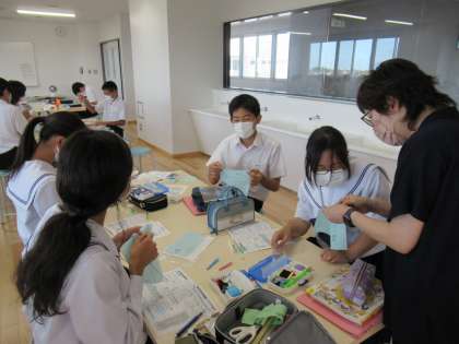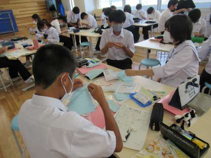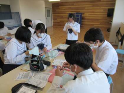 布にスナップボタンを付けています。縫い物が得意な男子生徒がたくさんいて、友達に教えてあげています。
