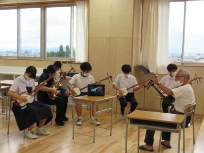 三味線の練習の様子です。顧問の先生も三味線を始めました。