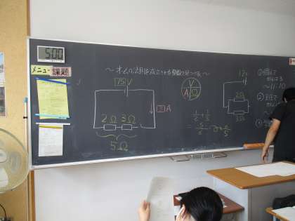「オームの法則」を用いて、回路図の計算問題を解いています。一人では難しいときは、グループの友達と力を合わせて難問に挑んでいます。