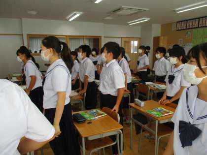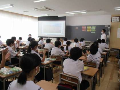 社会科の授業の初めに、今まで習った世界の気候について全員で確認しました。正解すると自然と拍手が起こっていました。