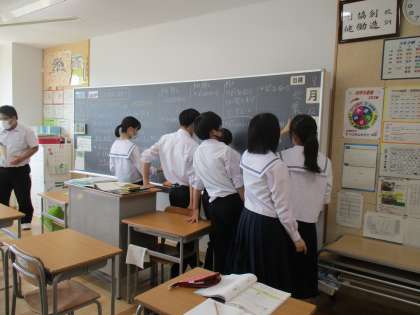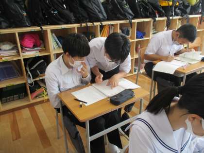 数学の時間はあちこちで学び合いの姿が見られます。わからないところは互いに教え合う習慣が、自然と身に付いています。