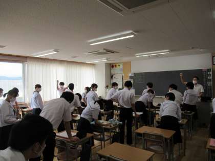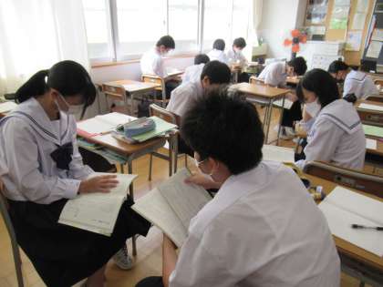 写真上は、英語の授業の様子です。語彙を増やすために、BINGOを行っています。