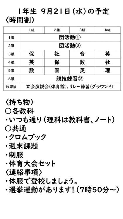 1年生の皆さん、元気に過ごしていますか。明日の予定をお知らせします。