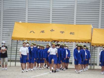 広いグラウンドに全校生徒が2メートル間隔をとって整列することができます。圧巻です。