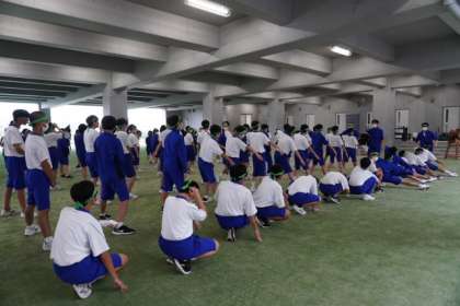雨バージョンで、ピロティ、集会室、体育館、柔剣道場をローテーションしながら、団演技の練習をしています。