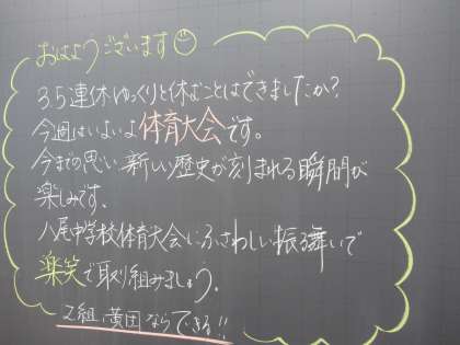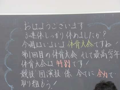 週明けの朝は、教室の黒板に担任の先生からの温かいメッセージ。