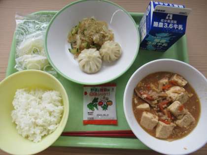 今日は、先日の休校による献立変更で、冷凍パインと野菜ふりかけが追加されています。豪華メニューです。少し肌寒い日となったので、冷凍パインがひんやりしますね。