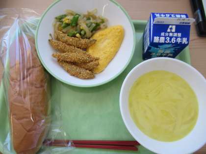 9月29日(木) 今日の給食は? 公開日 2022/09/29 更新日 2022/09/29 八尾中学校のページ 午前の部が終了し、給食です。 今日は、パンメニューです。 1 黒糖コッペパン 2 牛乳 3 かぼちゃのポタージュ 4 きびなごのさくさく揚げ(休業日に提供予定のもの) 5 オムレツ 6 アスパラサラダ 7 バナナ です。 20日の休業日に伴って、メニューが追加されています。豪華です。たくさん食べて、午後からも頑張りましょう。