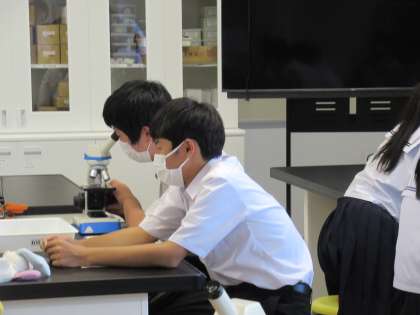 顕微鏡で葉の観察をしています。葉緑体は見えたかな。
