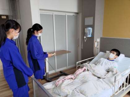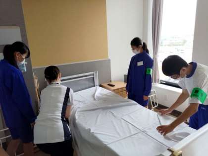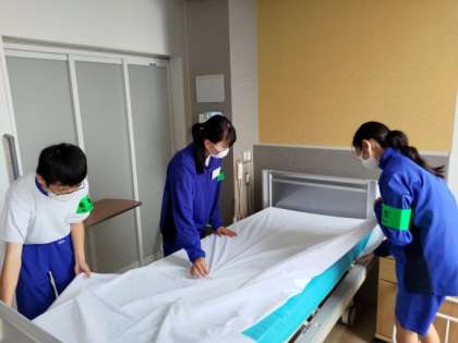 病院でしようされているベッドの作りを体験したり、ベッドメイキングをしたりしました。
