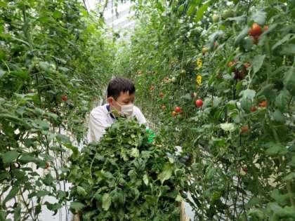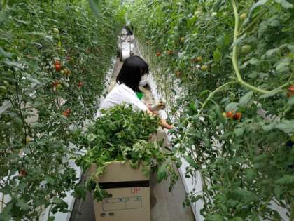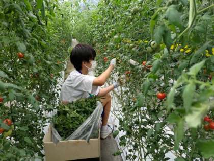 大きなハウスの中でミニトマトのわき芽を摘み取る作業をしています。