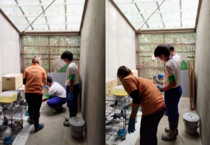 ハトにえさをあげたり、飼育場での掃除を行っていました。