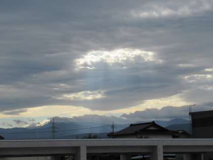 雲の合間から太陽の光が差し込み、幻想的な空です。