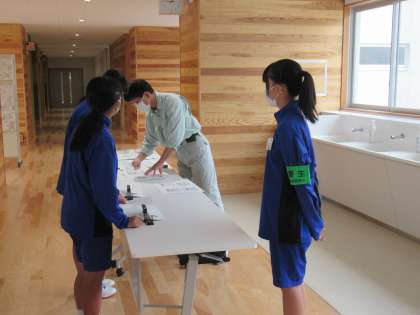 資料綴じの作業を手伝っています。