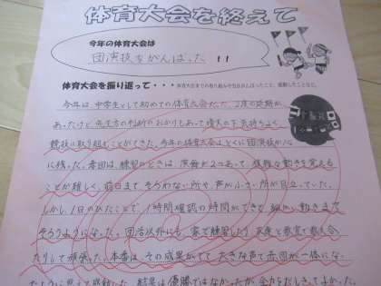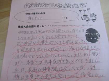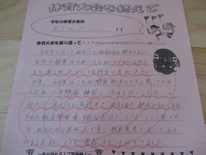 各学年の教室や学年フロアには、「体育大会を終えて」の作文が掲示してあります。