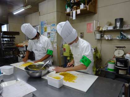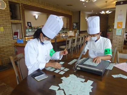 お店の割引券を作ったり、ケーキに使う栗の仕込みをしたりしています。制服を着て、本物のパティシエのようですね。