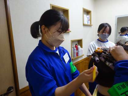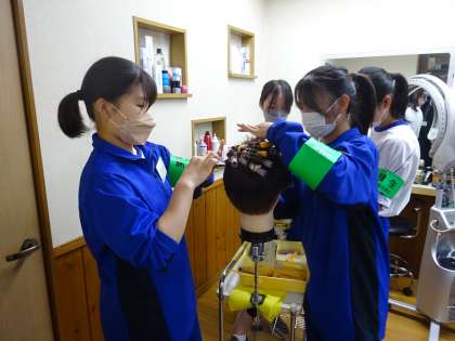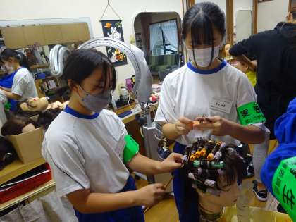 10月5日(水) 2年生 「社会に学ぶ『14歳の挑戦』」 ヘアーサロンココ 公開日 2022/10/05 更新日 2022/10/05 2学年 ヘアーサロンココでの活動の様子です。 今日はパーマのロット巻きに挑戦しています。簡単そうに見えますが、緩みなく髪を巻くのは大変難しく、みんな真剣な眼差しで作業をしています。