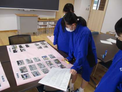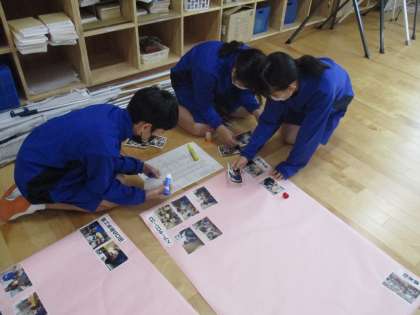 皆さんが事業所で活動している様子の写真を、掲示用に貼る作業を手伝ってくれています。