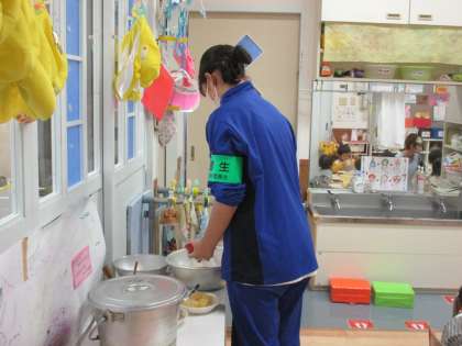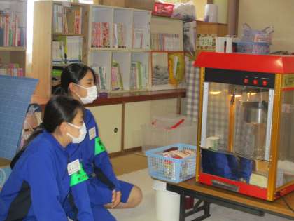 給食の準備をしたり、ポップコーンをつくる準備をしたりしています。何が始まるのかな。楽しそうですね。