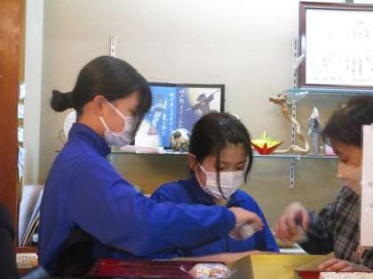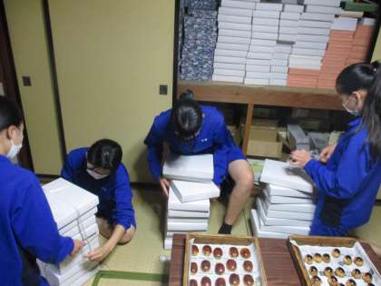 接客をしたり、お菓子の箱を組み立てたりしています。お菓子を丁寧に袋に詰めていきます。