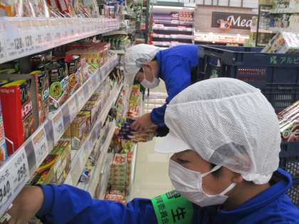 ちょうど品出しタイムの真っ最中で、品物を前の方に出したり、補充したりしています。