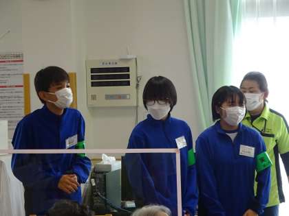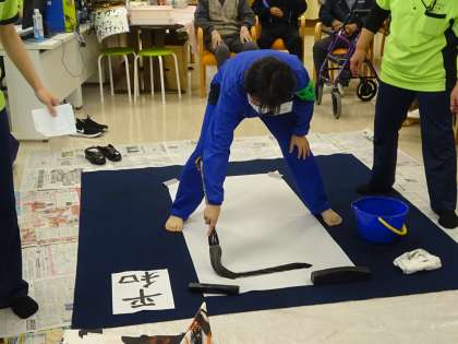 10月6日(木) 2年生 「社会に学ぶ『14歳の挑戦』」 デイサービスあおば 公開日 2022/10/06 更新日 2022/10/06 2学年 デイサービスあおばでの活動の様子です。 今日は利用者の皆さんに楽しんでいただくために、職員の方と書道パフォーマンスを行っています。緊張しながらも、堂々と文字を書いていました。