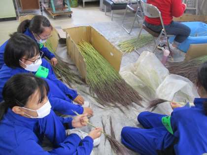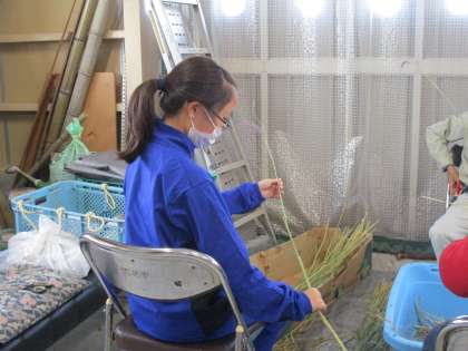 作業場で古代米のドライフラワーを束ねて、お正月用の玄関飾りになるパーツづくりをしています。