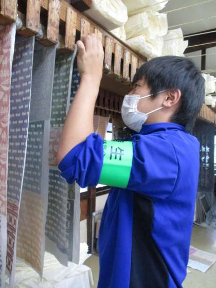 富山もようの和紙に裏紙を貼っています。この裏紙は、先日「裏紙もみ」をした紙です。慣れた手付きです。