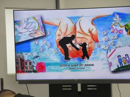 平和の絵を描き、学年で投票した絵をコラージュした1枚の絵(写真中央)を基に、一人一人が着色して全員で協力して1枚のアート作品を完成させます。