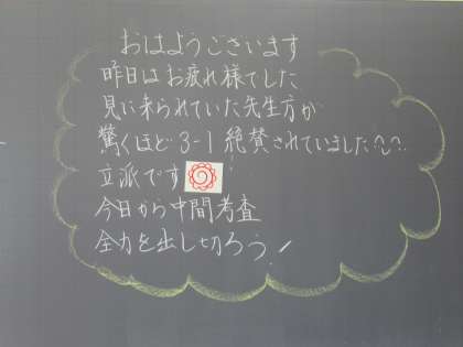 10月13日(木) 中間考査1日めの朝 公開日 2022/10/13 更新日 2022/10/13 八尾中学校のページ 今日と明日は、中間考査日です。学習の秋到来ですね。 「どきどきする」 「心配だからワーク3回やったんだけど」、、、と話す素敵な1年生。 YMC学習に参加し、最後の確認をしている頑張り屋の生徒、、、 素敵な朝です。もてる力を全て発揮できるよう粘り強く頑張りましょう。