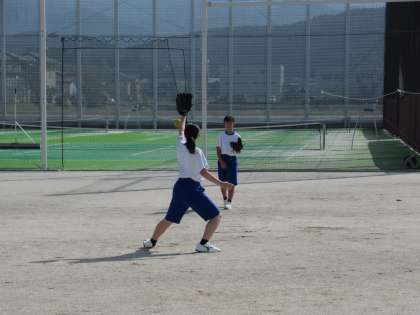 秋晴れのさわやかな空の下で、キャッチボール中です。