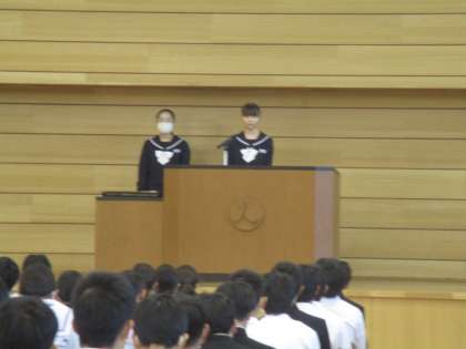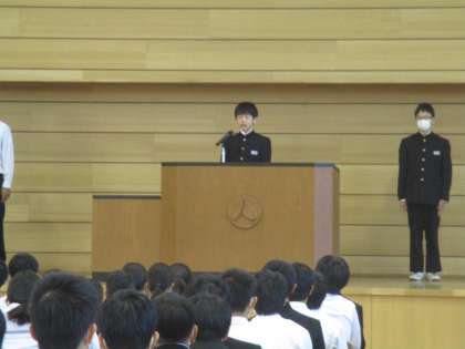 前期生徒会長からは、昨年度からの前期の活動の振り返りとともに、新生八尾中学校への想いが、それを引き継いでほしいとの願いが語られました。