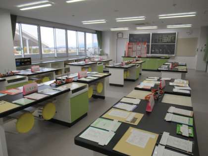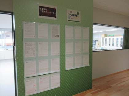 理科室には、夏休みの課題のレポートや科学作品展に出展した作品が展示してあります。
