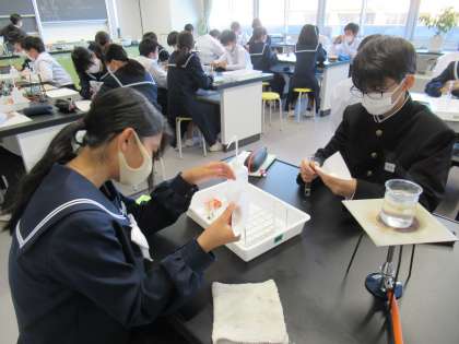 試験管に水と硝酸カリウムと食塩をそれぞれ入れて、溶ける様子を観察します。