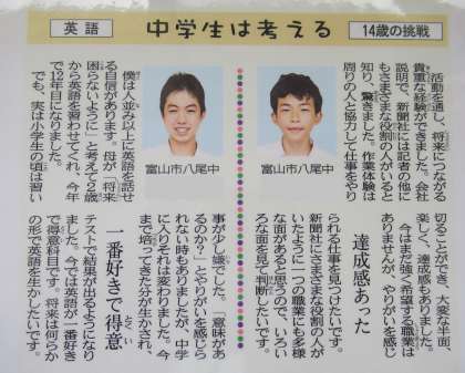 「14歳の挑戦」に取り組んだことを基に、日頃考えていること、思っていることについてインタビューされた記事です。