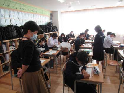 写真上は、数学の授業の様子です。教え合って学習しています。