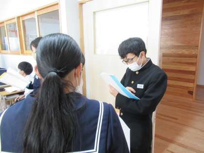 写真中は、英語の授業の様子です。ペアで今夜しなければならないことを、mustを使って伝え合っています。