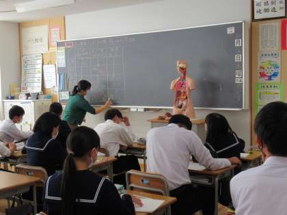 写真下は、理科の授業の様子です。人体模型を見ながら、消化のしくみについて学習しています。