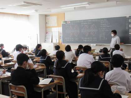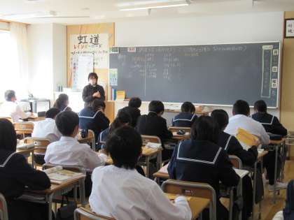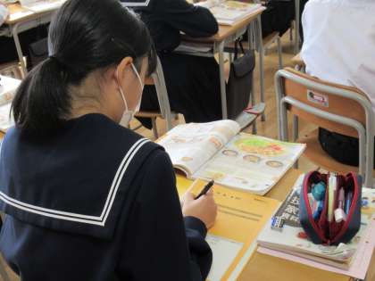 昨日、4組が一足お先に「豚肉の生姜焼き」「キュウリとわかめの酢の物」を調理実習で作りました。その実習に向けて、作り方、ショウガの役目等を学習しています。真剣に聴いています。