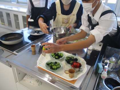 初めての実習の献立は「豚肉のしょうが焼き」と「きゅうりとわかめの酢の物」です。1時間と短い時間でしたが、しっかり事前に計画をたてたおかげで、みんな協力してテキパキと活動し、時間内に試食をすることができました。