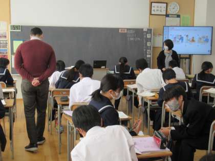 写真上・中は、英語の授業の様子です。今日はALTのJ先生との授業です。