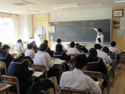 写真下は、数学の授業の様子です。比例のグラフについて学習しています。X軸、Y軸、座標、、、新しい言葉が出てきましたね。